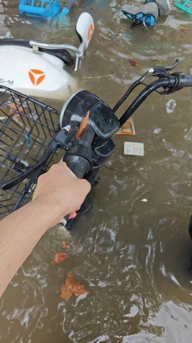 8月7日上午11点多,家住郑州高新区的李先生买完菜走出商场时,发现路面积水已迅速上涨,水位淹没了电动车座。