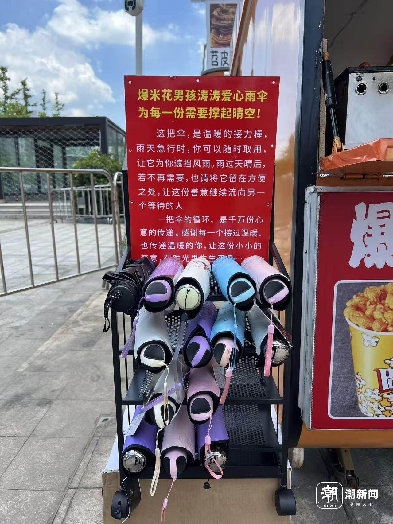 她和涛涛一商量,便去市场采购了几十把雨伞,在摊位前支起了一个爱心雨伞架。