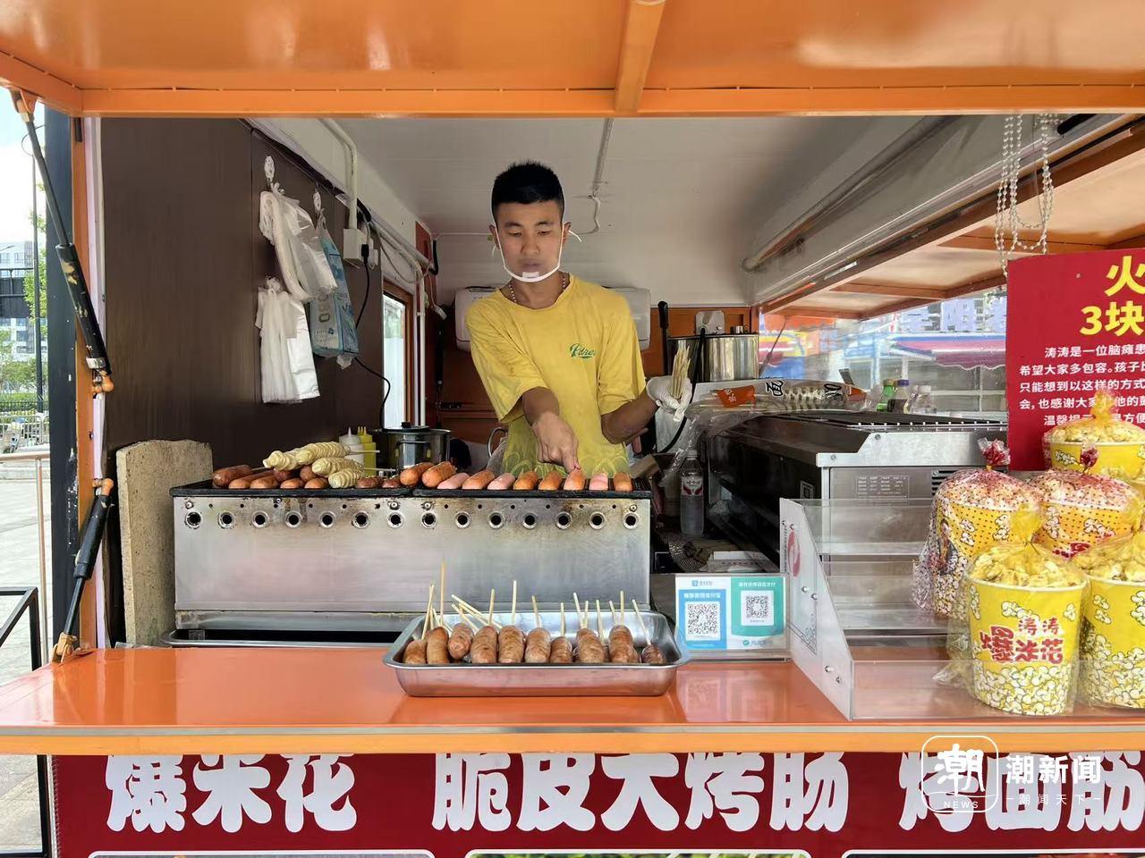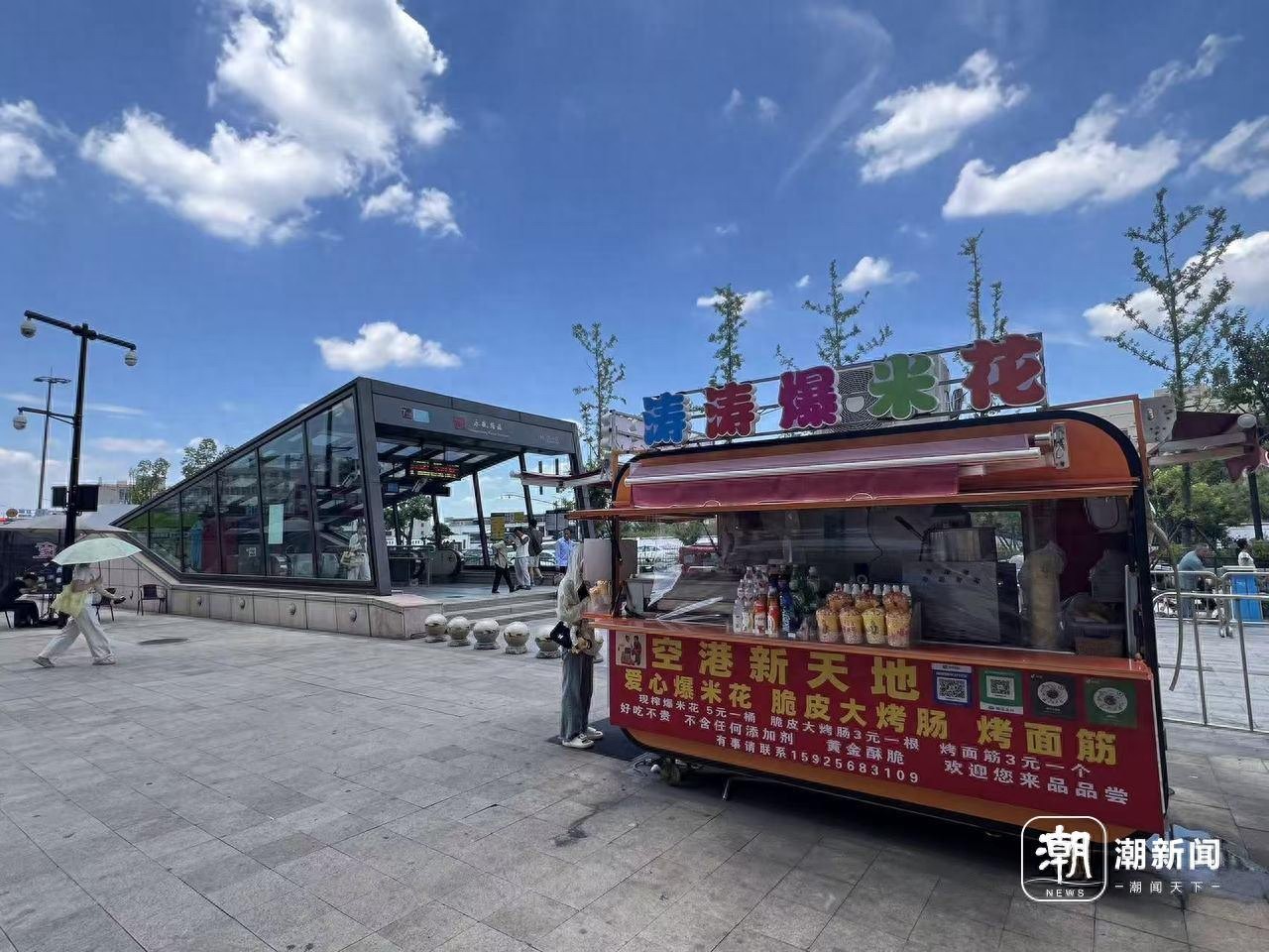 车子就停放在永盛路地铁站H口边上,紧挨着空港新天地商场,上面挂着“涛涛爆米花”的彩色招牌,下面写着“爱心爆米花、脆皮大烤肠、烤面筋”,台面上还摆着不少饮料。涛涛的摊位经营范围更广啦!