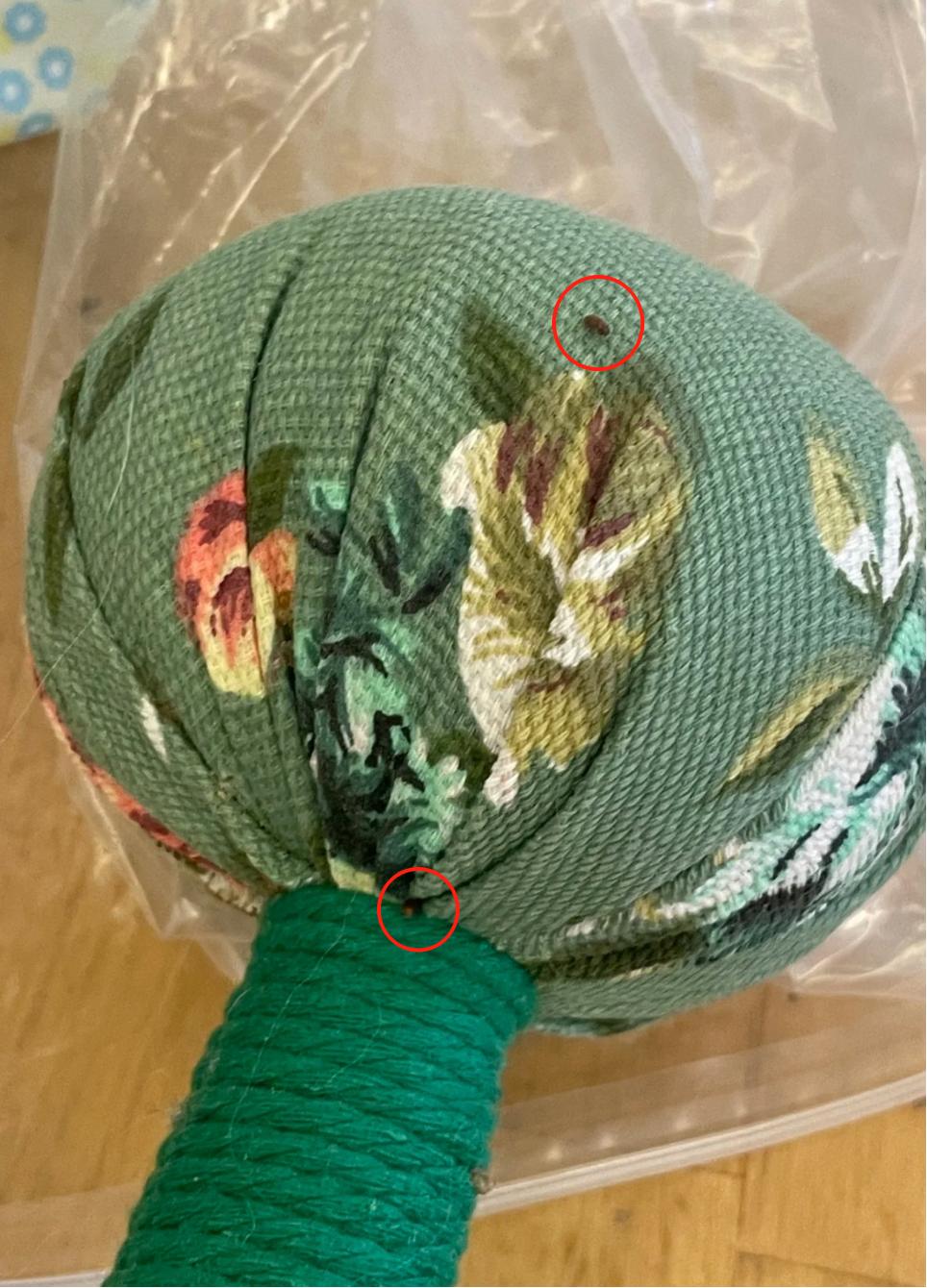 张女士告诉记者,根据网友们的经验,她追溯源头把家中那把买来一年多的艾草锤列为了重点怀疑对象。“学着网友的方法,用密封袋套住艾草锤做实验,三天后果然发现了它们的踪影。平时拿艾草锤用来敲敲打打,感觉还挺养生的,没想到居然成了这些小虫子的‘繁殖基地’了。”