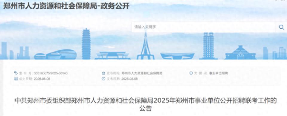 8月8日,郑州市事业单位公开招聘联考工作公告在郑州市人力资源和社会保障局网站、郑州市人事考试中心网站发布。参加联考的开发区、区县(市)工作专用网站转发。2025年郑州市事业单位公开招聘联考工作专用网站及咨询、监督电话详见附件2。