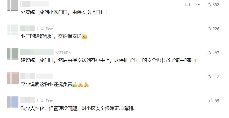 许多网友认为小区规定对外卖骑手过于严苛,送餐流程繁琐,物业以“安全”和“管理”为由设置的限制缺乏合理性,保安全程陪同却未优化配送效率,建议物业直接承担配送责任或者引入机器人配送,可以减少骑手负担。