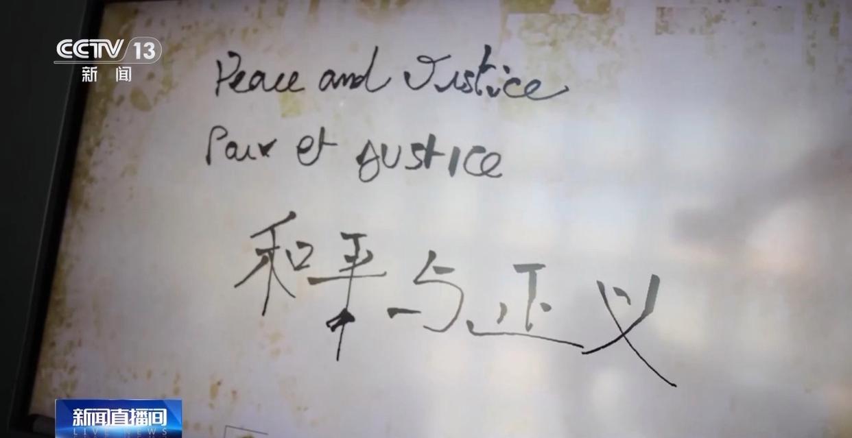 参观完毕后,马库斯和士杰、钟灏松在留言板上用中、英、法三国语言写下了“和平与正义”的留言。