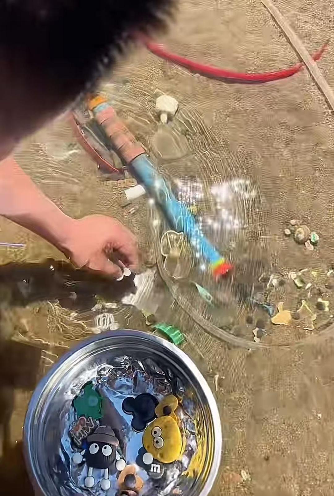 在唐先生的社交账号上,红星新闻记者看到,截至目前其累计发布了18条有关捡鞋花的视频。其中,唐先生捡到的鞋花几乎盛满了三四个盆子。另外,在视频里,记者还看到,唐先生也相继捡到过游客玩耍后扔掉的水枪、脸盆等道具。