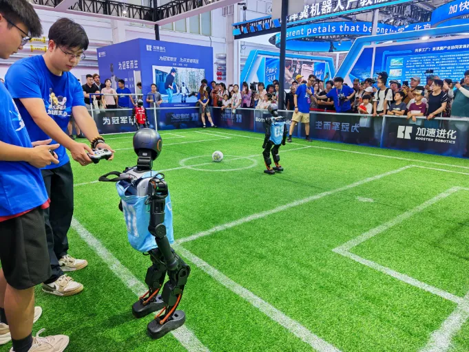 2025世界机器人大会已于8月8日开幕,每年大会的博览会无疑是最受关注的活动。记者注意到,今年的博览会设置了多个赛场,其中机器人足球赛和格斗赛等吸引许多观众围观。加速进化公司的机器人足球世界杯冠军机型T1和K1双双亮相。它们的实力为何这么强?新京报记者采访了加速进化副总裁赵维晨。