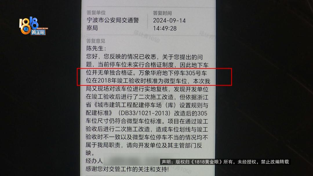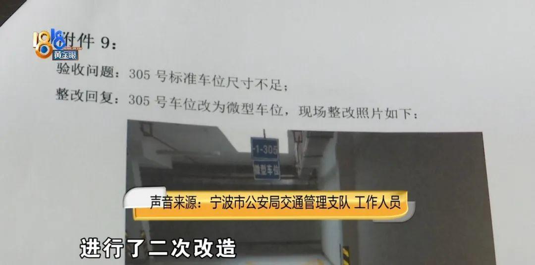 宁波市公安局交通管理支队 工作人员:它的长度和宽度都是比304车位要短的,这个车位当时现场验收的时候,也挂了微型车位这样一个标志的。开发商在通过竣工验收以后进行了二次改造,重新对地坪进行了环氧这些施工,施工以后标线重新划过了,长度就跟304划成一样了,其实这个是有错误的。我们也通知了开发商,让他们一定要恢复到跟竣工验收一样的状态。
