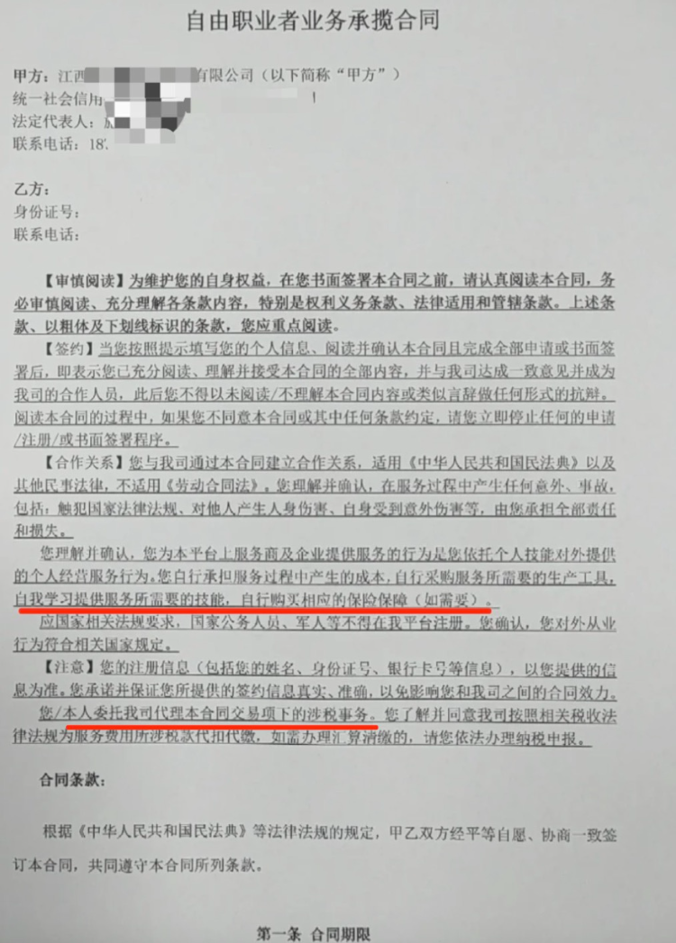 8月8日,上游新闻(报料邮箱:baoliaosy@163.com)查阅网帖图片看到,该《自由职业者业务承揽合同》标明:甲乙双方建立的是“合作关系”,适用《民法典》及其他民事法律法规,不适用《劳动合同法》。合同还写明,乙方(个人)需“自行承担业务风险,自行购买保险保障”。尽管未出现“雇佣”或“劳动关系”的明确否定表述,但整体措辞已隐含不构成劳动关系的意图。