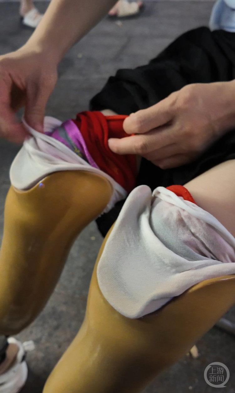 陈玲每天会在腿上套四层袜子再穿戴义肢,因为摆摊需要不停走动,断肢处常常会受伤很痛。但购买一副更好的义肢需要十几万元甚至几十万元,她不敢想。