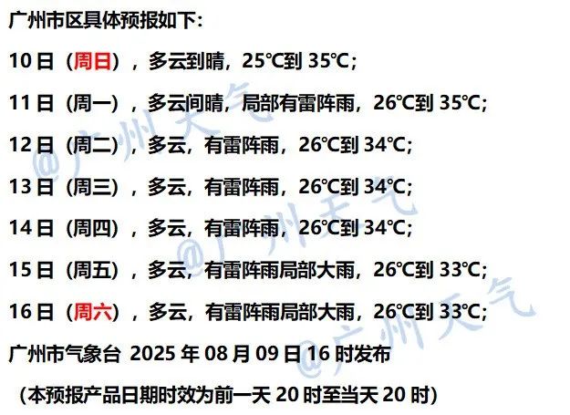 广州市气象台预计,8月10日—11日受副高环流控制,广州高温炎热持续,午后局部有雷雨。8月12日起广州天气又趋不稳定。