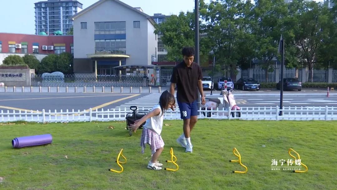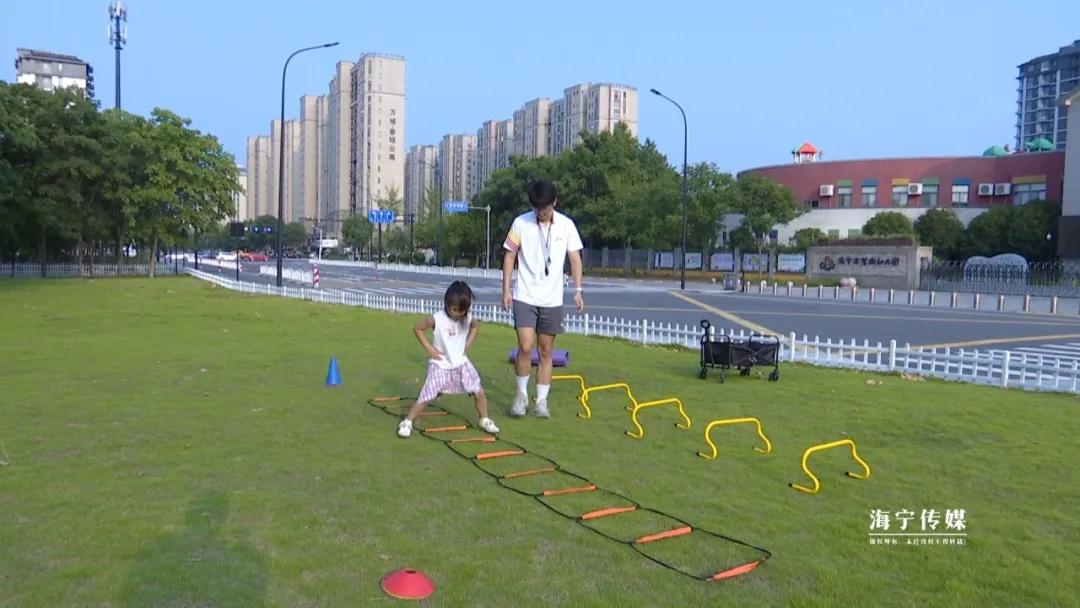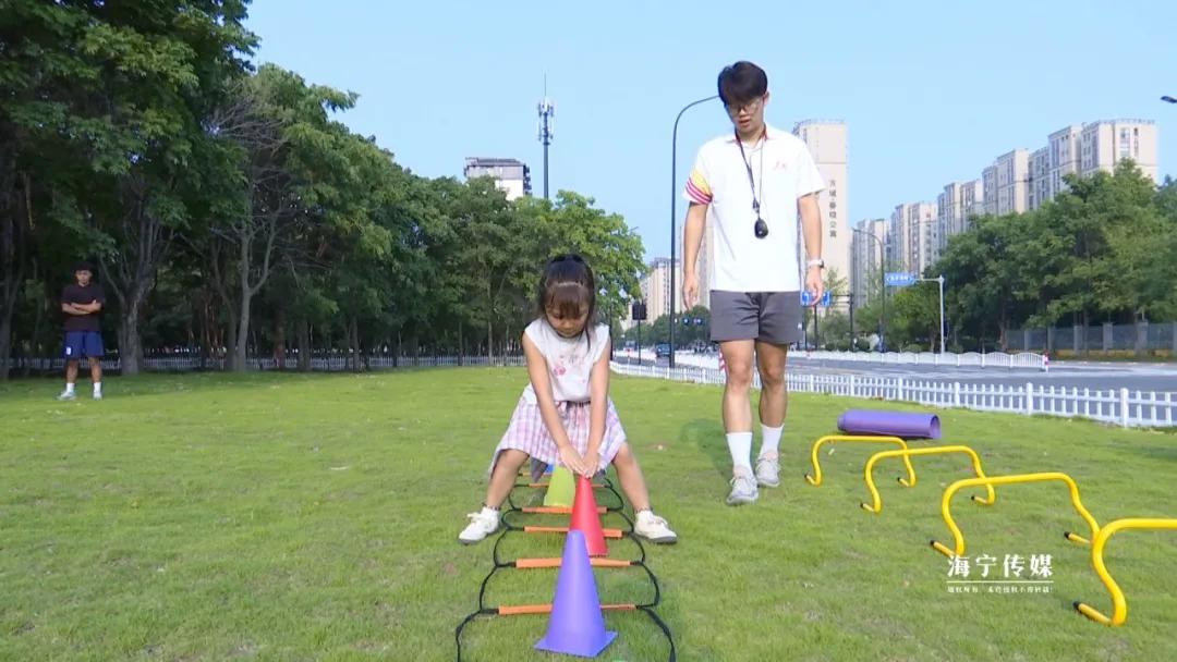 近日下午,在市区一处户外草地上,他们正在给今年6岁的学员李若曦开展体适能训练。“注意双脚并拢,像小兔子一样轻轻跳进圈里,保持平衡!”李浙辉一边讲解动作要领,一边与欧富原配合示范。李若曦模仿着教练的样子,一蹦一跳地向前。