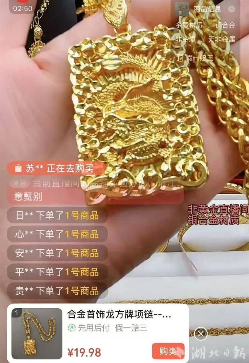 在一不知名品牌直播间,一款备注合金的龙方牌项链售价19.98元,虽直播屏幕有“非黄金直播间、铜合金材质”提醒,但在灯光和镜头的包装下,金光闪闪的外观仍吸引不少人下单。