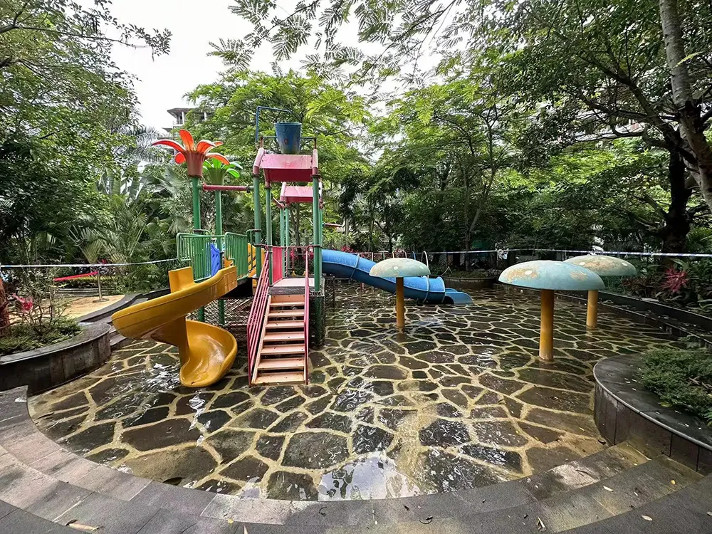 当日18时左右,妈妈带着悦悦穿过室内泳池来到户外,路过温泉池、户外戏水池,再走过一条小路才找到“儿童水寨” 戏水池游玩。这个水寨位于酒店客房附近的温泉区,采用动态循环水系统,游乐区域由平台、滑滑梯、水蘑菇等设施组成,水泵启动后,水流通过回水装置形成喷泉效果。悦悦身高1.25米,水寨内的水位刚好没过她的膝盖,旁边的告示牌上明确标注着该区域供3岁至8岁儿童使用。