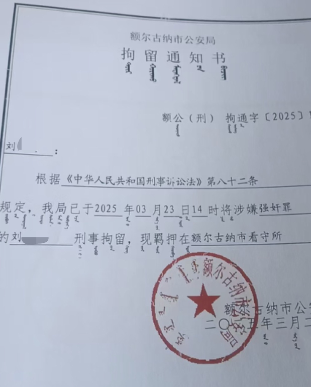 据刘女士出具的一张额尔古纳市公安局拘留通知书显示,该局于2025年3月23日14时,将涉嫌强奸罪的刘军刑事拘留,现羁押在额尔古纳市看守所。