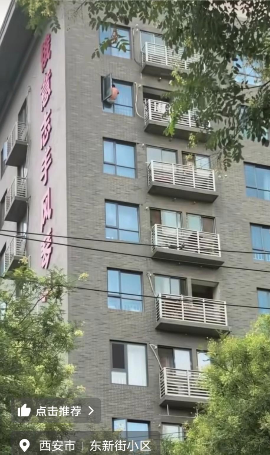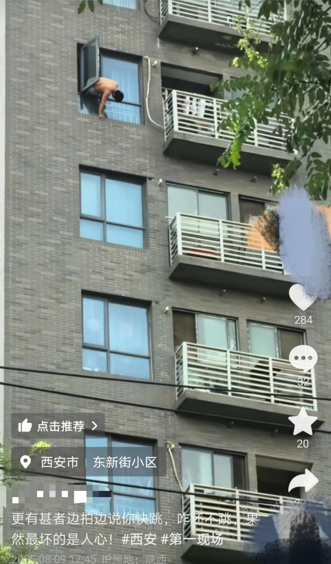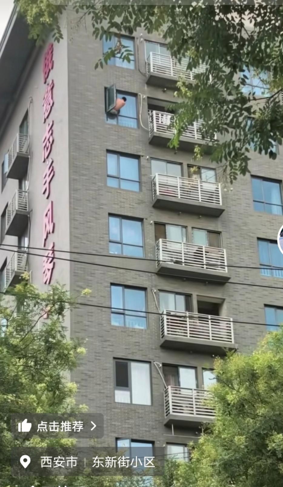 8月9日,网友发视频反映,新城区东新街路边一楼栋上一男子欲跳楼。视频显示,该男子大约位于6楼,将大半个身子伸出窗外,持续几秒后有欲回窗的动作,但并未完全回去。