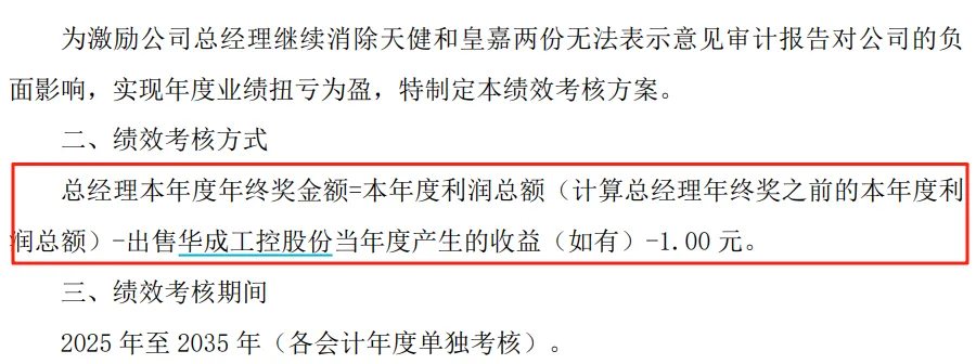 在此之前,伯朗特董事会曾于7月底否决《关于总经理绩效考核的议案》。该议案显示总经理的绩效考核方式为:总经理本年度年终奖金额=本年度利润总额(计算总经理年终奖之前的本年度利润总额)-出售华成工控股份当年度产生的收益(如有)-1.00元。绩效考核期间为:2025年至2035年(各会计年度单独考核)。