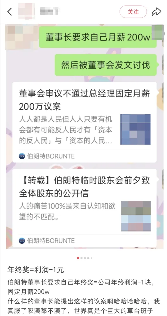近期,中国基金报记者关注到,有网友在社交平台上分享伯朗特的“奇葩”故事:董事长、总经理尹荣造要求自己固定月薪200万元、年终奖为“公司利润-1元”,但被董事会予以否决。记者查询寻伯朗特相关公告发现,该情况属实。
