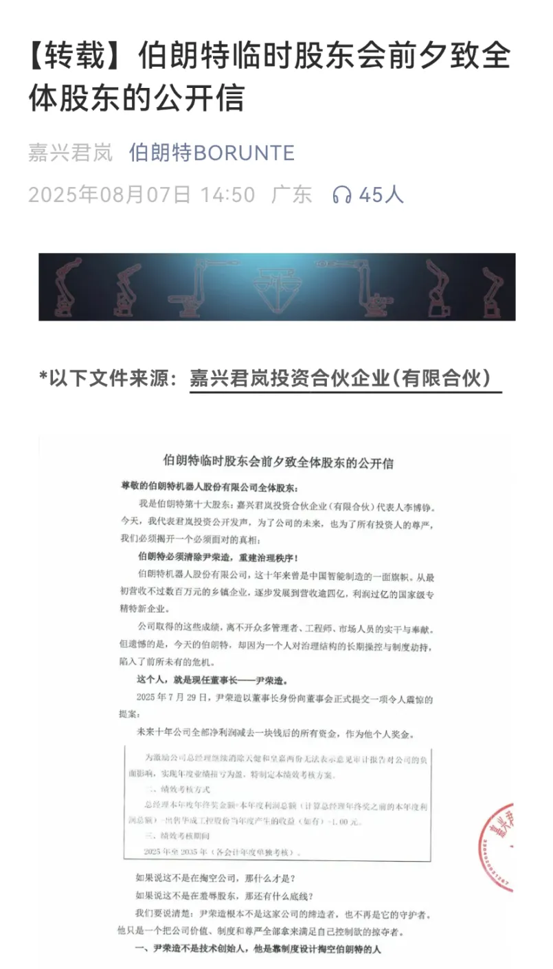 在公开信中,李博铮(嘉兴君岚代表人)称,尹荣造以董事长身份向董事会提交一项令人震惊的提案:未来十年公司全部净利润减去一块钱后的所有资金,作为他的个人奖金。李博铮将尹荣造称为“一个把公司价值、制度和尊严全部拿来满足自己控制欲的掠夺者”,并表示“伯朗特必须清除尹荣造,重建治理秩序”。