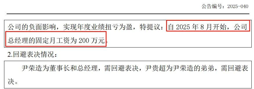 议案中提到,会计师事务所对公司出具了无法表示意见的审计报告,导致公司从股转系统摘牌,企业信誉及市场销售受到严重影响。公司采取了一系列措施,但摘牌影响仍然巨大。为激励公司总经理继续消除两份无法表示意见审计报告对公司的负面影响,实现年度业绩扭亏为盈,特提议:自2025年8月开始,公司总经理的固定月工资为200万元。