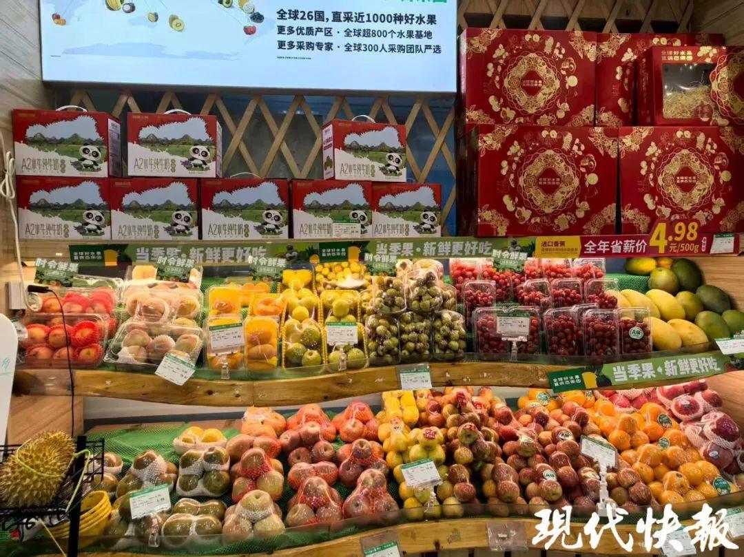 8月10日,现代快报记者在南京新街口附近一家百果园水果店看到,店内环境光鲜亮丽,水果品种琳琅满目,大部分都用透明薄膜包装好。