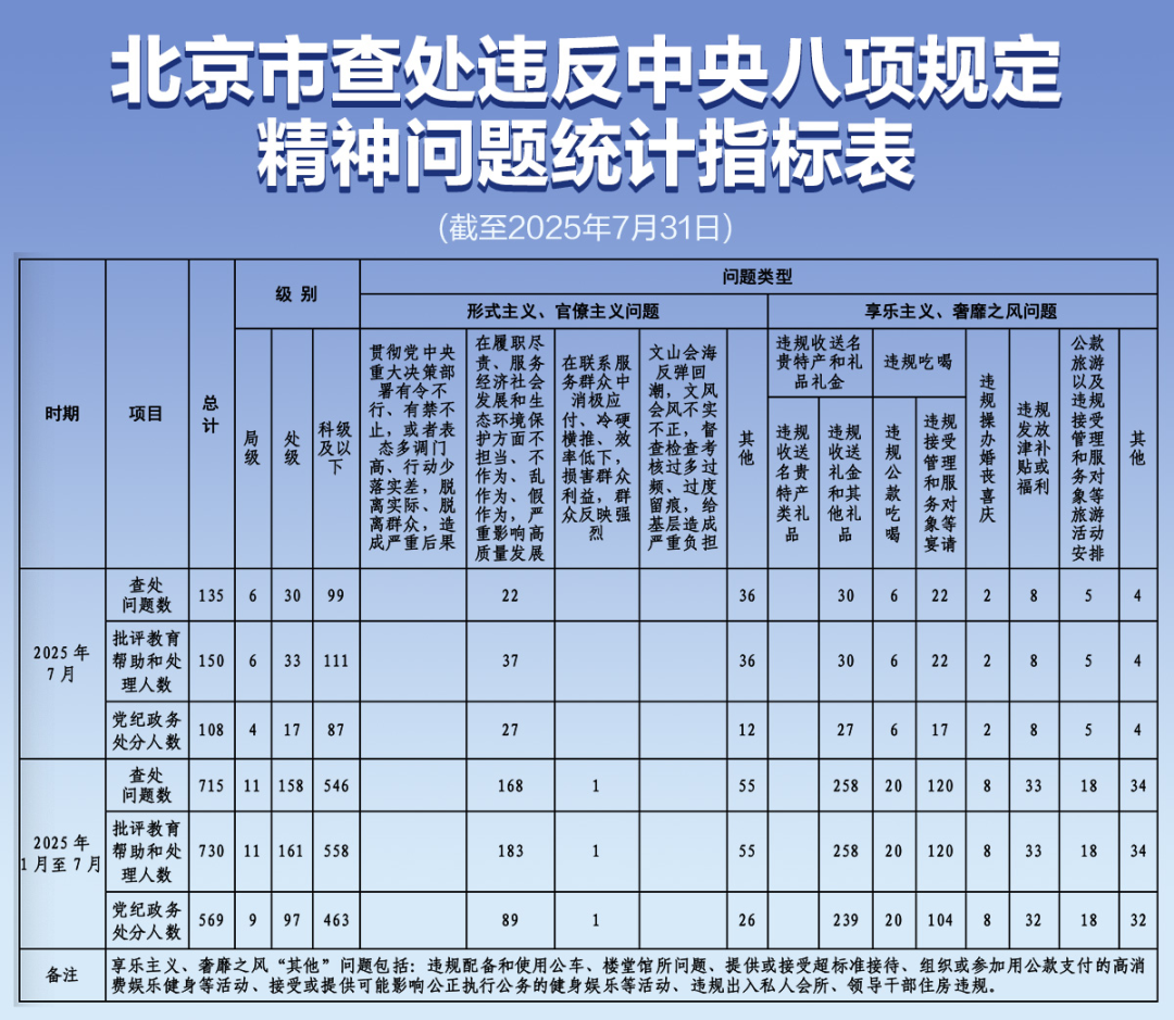 日前,北京市纪委监委公布今年1月至7月查处违反中央八项规定精神问题统计指标表。截至7月31日,累计查处违反中央八项规定精神问题715起,批评教育帮助和处理730人,其中局级11人、处级161人、科级及以下558人。