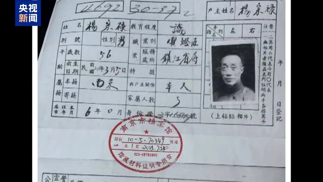80年前的登记照片,太爷爷眼神清亮,一袭长衫、一副圆框眼镜,干净、体面。工整的毛笔字写着,他是一位“电灯匠”。尽管从未谋面,但杨女士透过档案看到,他们拥有着相似的鼻子和轮廓,也能真切体会到血脉相连。