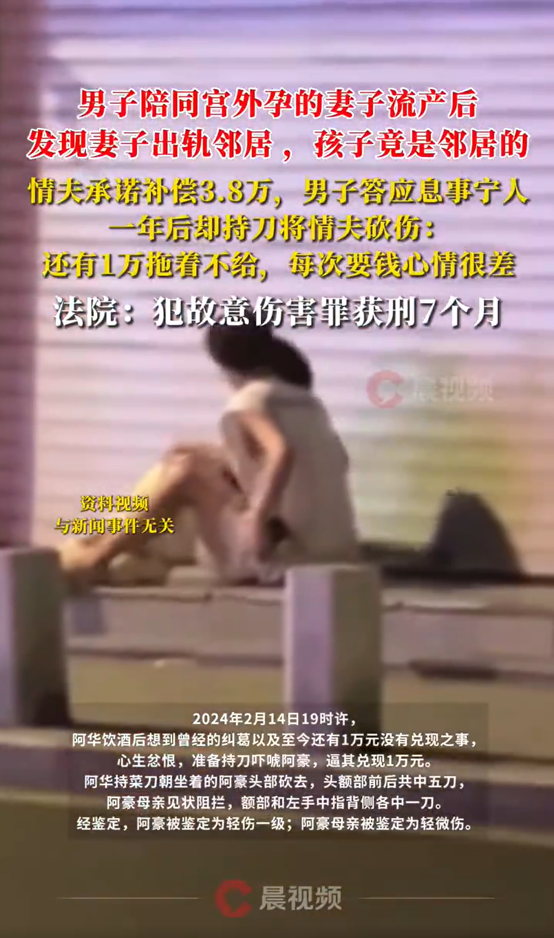 阿华陪妻子做完流产手术,过后发现妻子的怀孕是与阿豪婚外情导致,阿豪也承认了婚外情,承诺给予3.8万元的补偿。之后陆续支付2.8万元,截至案发,仍有1万元没有兑付。