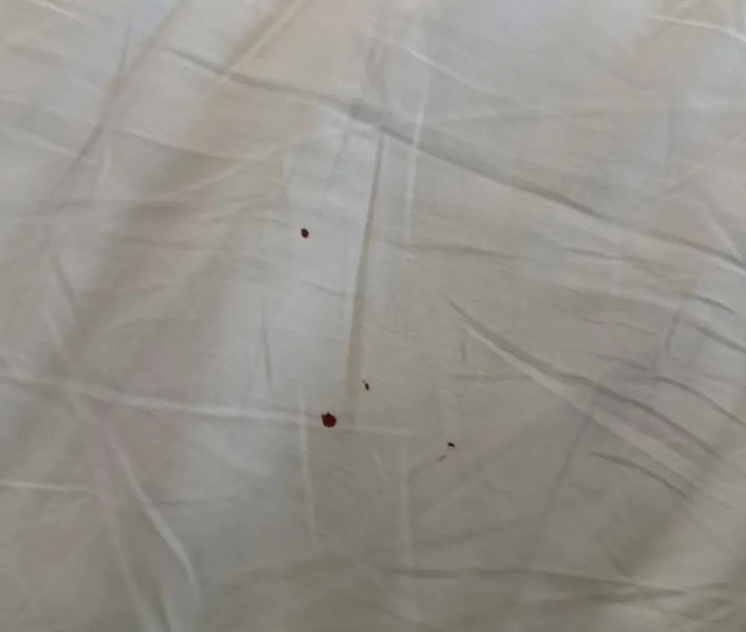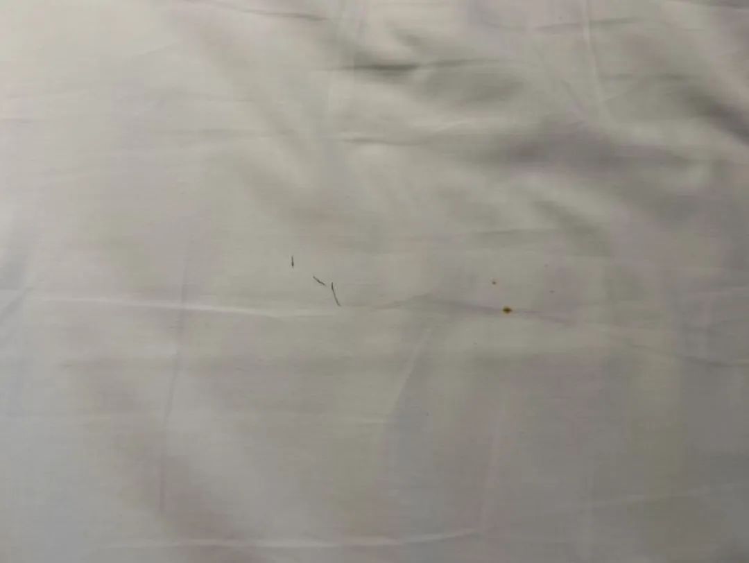 “前一晚好早就睡了没有看,我女儿有叠被子的习惯,今天早上起来后就过来说帮我叠被子,然后看到床单上的血迹、锈迹异物。”杨先生说,发现后他便找了店里的负责人,对方称,床单都经过清洗消毒了,锈迹可能是洗不掉的,血可能是蚊子血或者是我的。