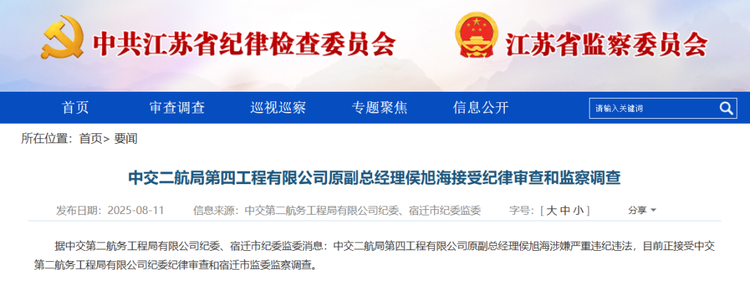 据中交第二航务工程局有限公司纪委、宿迁市纪委监委消息:中交二航局第四工程有限公司原副总经理侯旭海涉嫌严重违纪违法,目前正接受中交第二航务工程局有限公司纪委纪律审查和宿迁市监委监察调查。