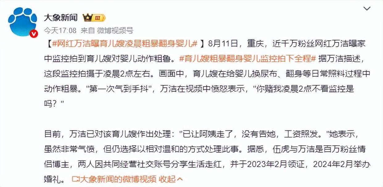 目前,万洁已对该育儿嫂作出处理:"已让阿姨走了,没有告她,工资照发。"她表示,虽然非常气愤,但仍选择以相对温和的方式处理此事。据悉,伍虎与万洁是百万粉丝情侣博主,两人因共同经营社交账号分享生活走红,并于2023年2月领证,2024年2月举办婚礼。