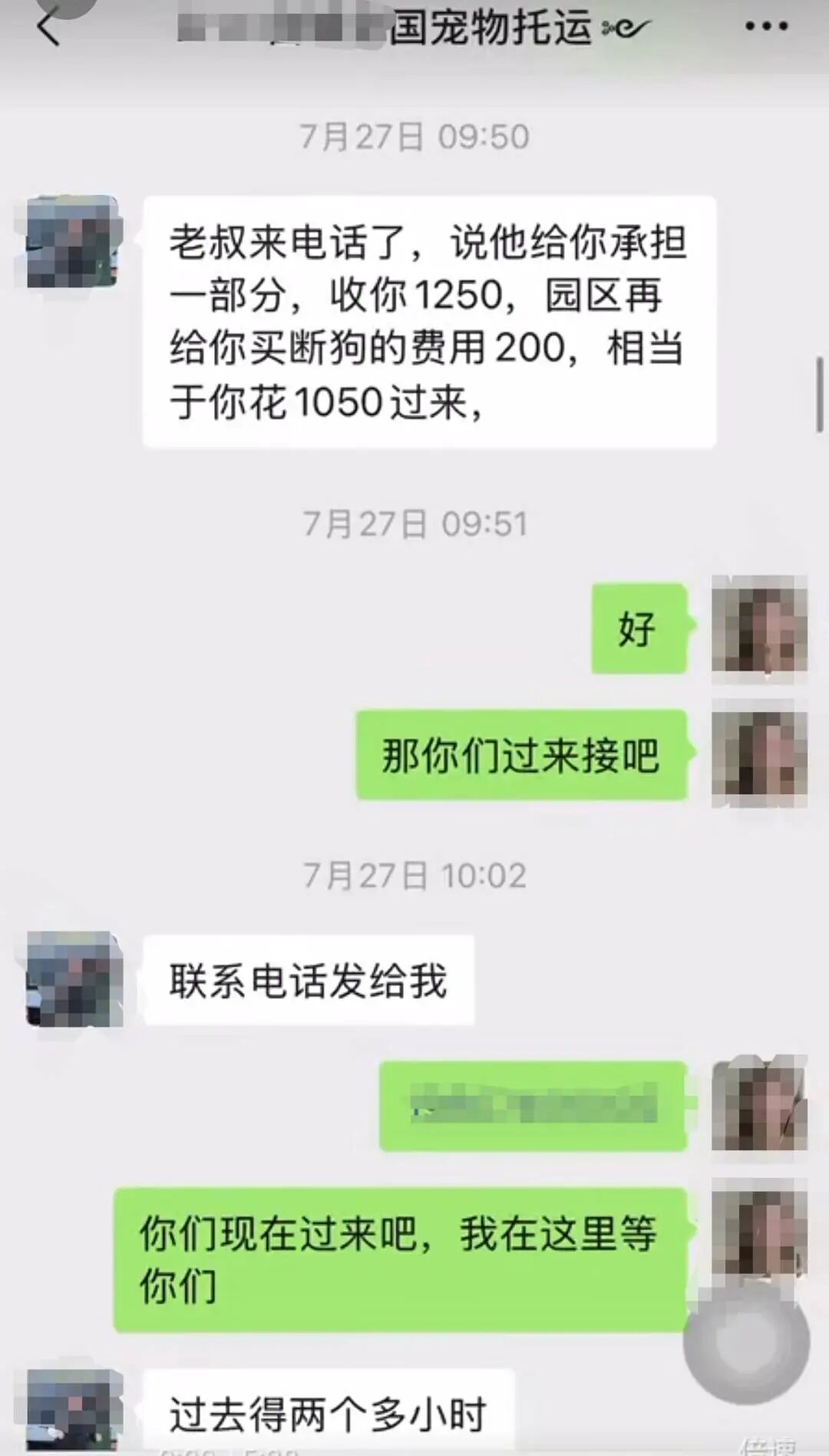 7月下旬,“图图”再次失控,咬伤别人的小型犬。张丽陪同对方主人前往宠物医院治疗期间,“图图”情绪激动,她再次联系老叔和托运公司。托运公司表示,需要签合同放弃狗的所有权,托运公司会支付200元费用,狗主人自行承担1050元的托运费(200元从中扣除)。