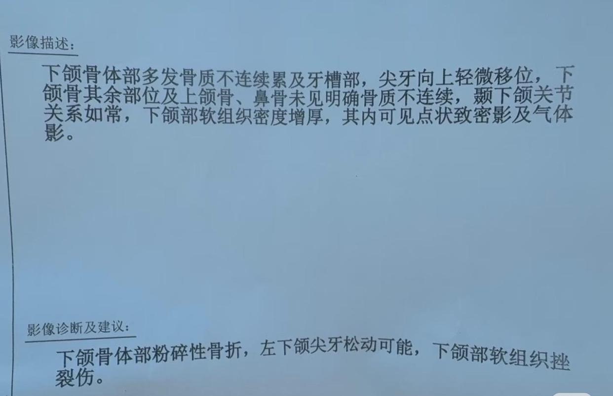“在附近医院紧急处理后,我现在在城里一家三甲医院住院治疗,8月8日刚做完了骨折手术。”陈先生也向记者展示了医院的就诊证明,其中影像诊断结果显示:下颌骨体部粉碎性骨折,左下颌尖牙松动可能,下颌部软组织挫裂伤。至于具体治疗费用,陈先生则不愿多说。