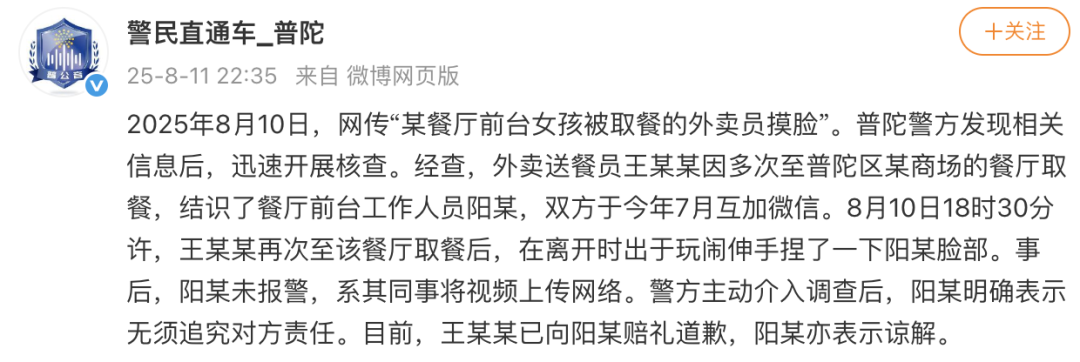 外卖送餐员王某某因多次至普陀区某商场的餐厅取餐,结识了餐厅前台工作人员阳某,双方于今年7月互加微信。8月10日18时30分许,王某某再次至该餐厅取餐后,在离开时出于玩闹伸手捏了一下阳某脸部。事后,阳某未报警,系其同事将视频上传网络。警方主动介入调查后,阳某明确表示无须追究对方责任。目前,王某某已向阳某赔礼道歉,阳某亦表示谅解。