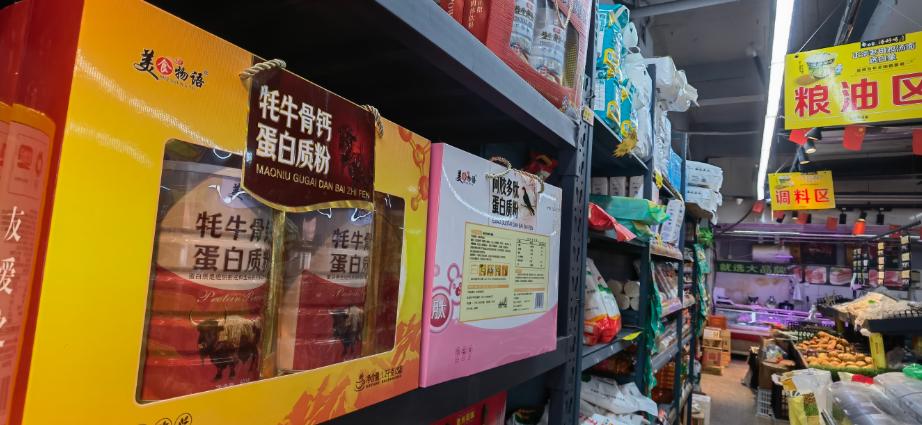 调查期间,记者看到前来这些店铺购买“蛋白质粉”的消费者络绎不绝。记者仔细查看这些产品的营养成分表,看到大部分产品中每100克含量里蛋白质含量不足10克,最高的也只有16克,最低的一款牦牛骨钙蛋白质粉每100克产品中蛋白质含量只有2.9克。