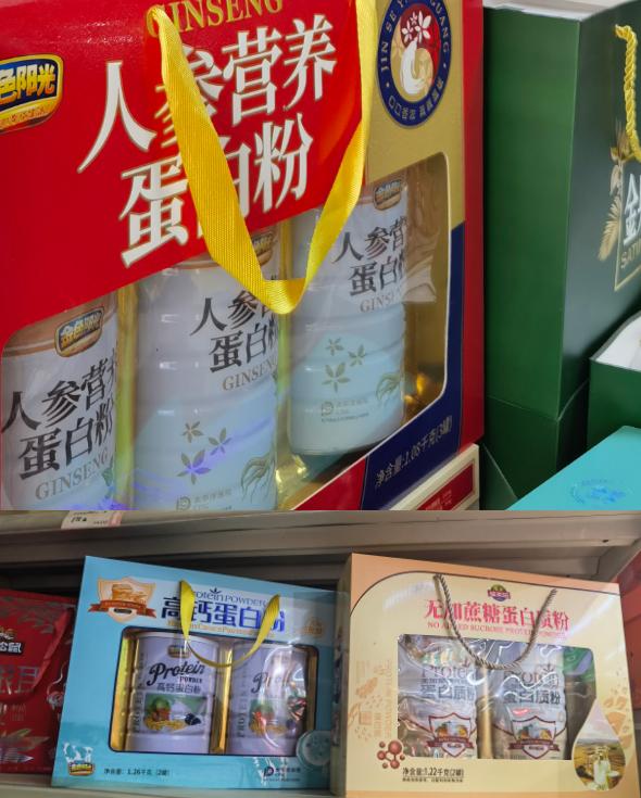 记者粗略统计了一下,这些店铺里的“蛋白质粉”产品名称有:中老年加钙蛋白质粉、牦牛骨钙蛋白质粉、无加蔗糖蛋白质粉、高钙蛋白质粉、益生菌高钙驼乳蛋白质粉、阿胶多肽蛋白质粉、中老年益生菌蛋白质粉、海参肽高钙蛋白质粉、灵芝蛋白质粉、人参营养蛋白质粉等。