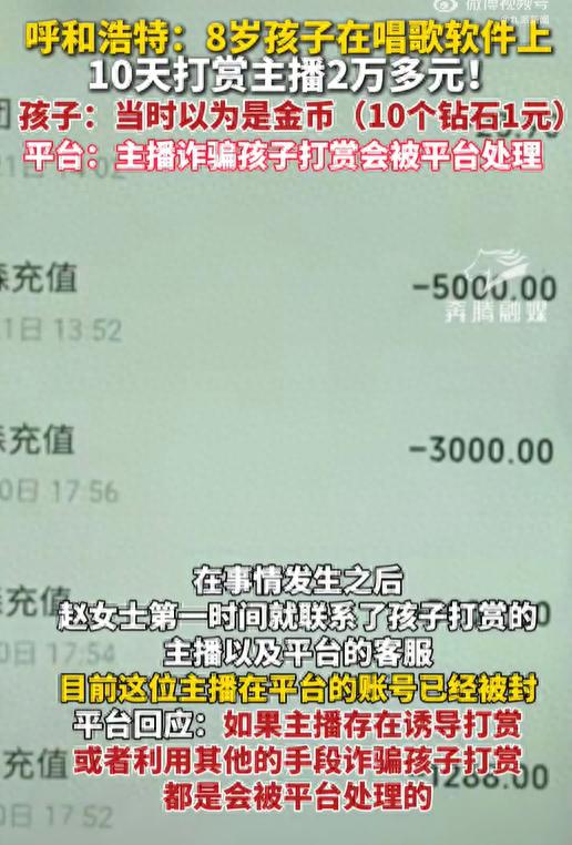 在事情发生之后,赵女土第一时间就联系了孩子打赏的主播以及平台的客服,目前这位主播在平台的账号已经被封,平台回应称,如果主播存在诱导打赏,或者利用其他的手段诈骗孩子打赏,都是会被平台处理的。