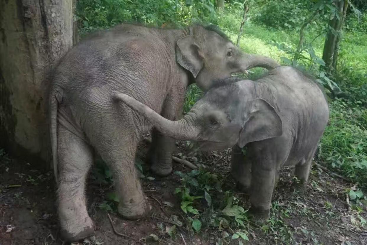 幼年的“羊妞”(右)和“小强”(左)一同在野外活动(资料图)。新华网发(云南西双版纳国家级自然保护区管护局 供图)