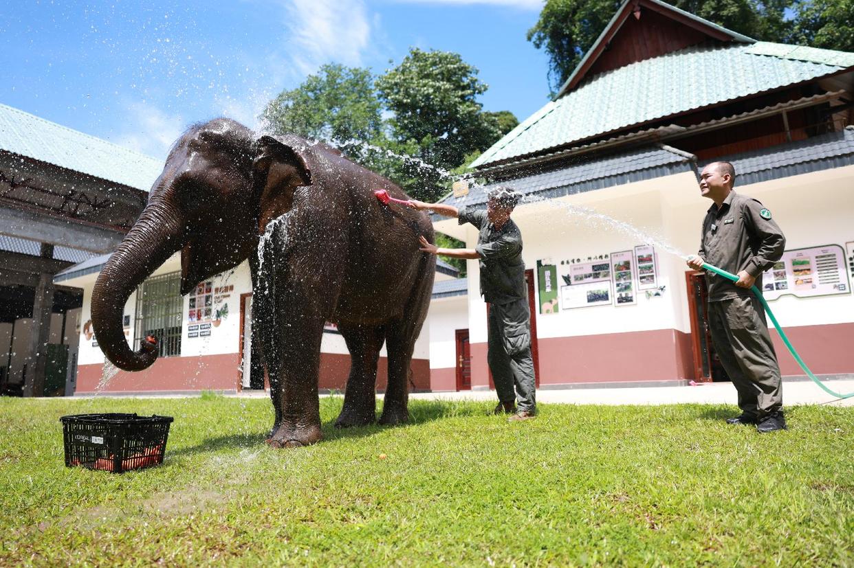 “象爸爸”给羊妞洗澡(6月29日摄)。新华网发(徐华陵 摄)