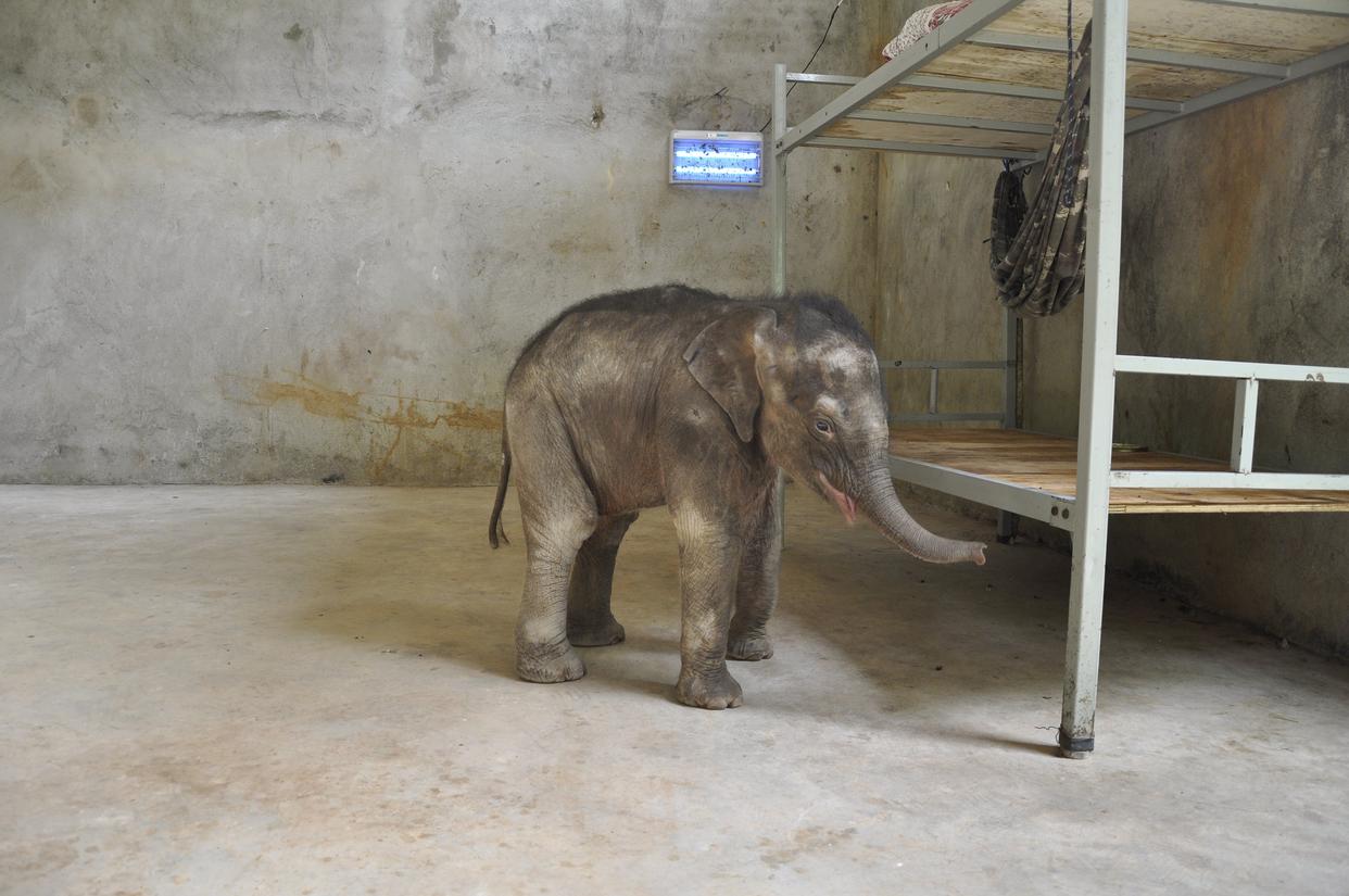 幼年“羊妞”在“象爸爸”的床前玩耍(资料图)。新华网发(云南西双版纳国家级自然保护区管护局 供图)