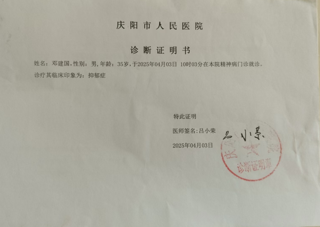 之后,邓建国被工作单位辞退,在医院诊断出“患抑郁症”。