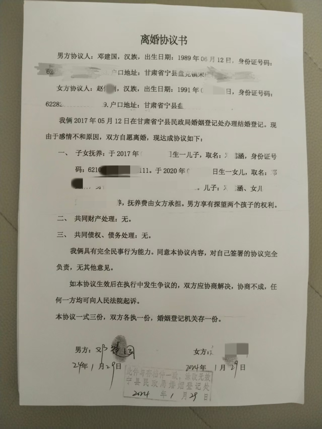 双方在2024年1月29日以感情不和为由签订《离婚协议书》,两个孩子由女方抚养。