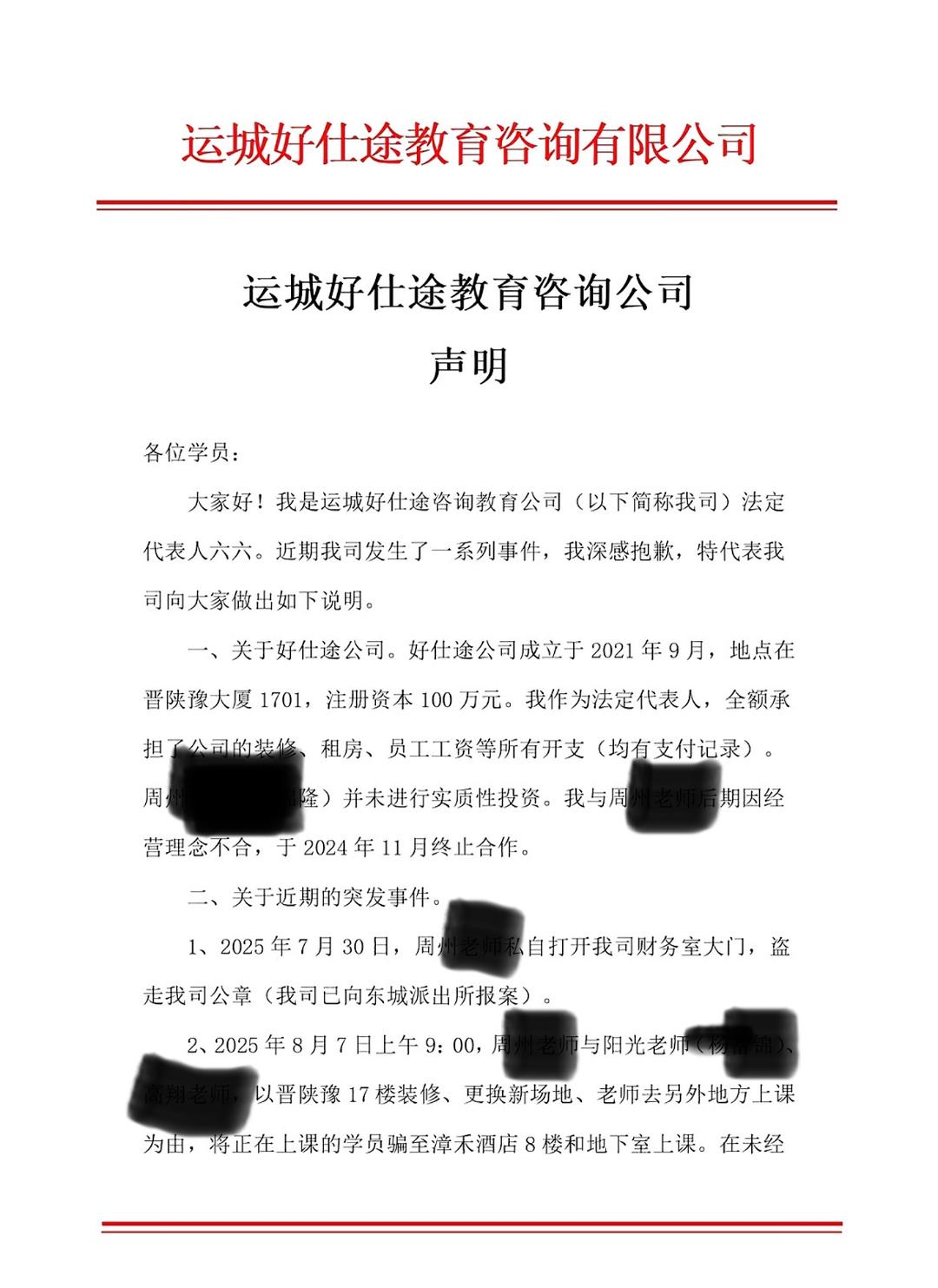 8月12日,网传视频,一女子拿刀架着自己的脖子,疑讨学费无果,视频显示,事发山西好仕途教育(运城校区),11日这家公司在社交平台发布声明,称7月30日公司公章被一周姓老师私自拿走,学员还被其和另外两名老师诱导签署三方转让协议。