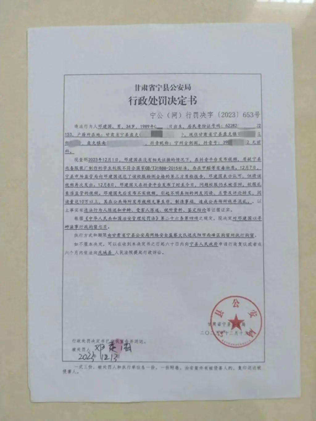 兆春服装厂(校服供应商)以“订单被取消”为由,于2023年12月8日向宁县公安局报案,要求追究邓建国“寻衅滋事”或“散布谣言”责任。宁县公安局网安大队受案后,于12月13日作出《行政处罚决定书》,认定邓建国“无相关证据情况下发布不实视频,引起网友转发,造成公共场所秩序混乱”,决定对其行政拘留7天。