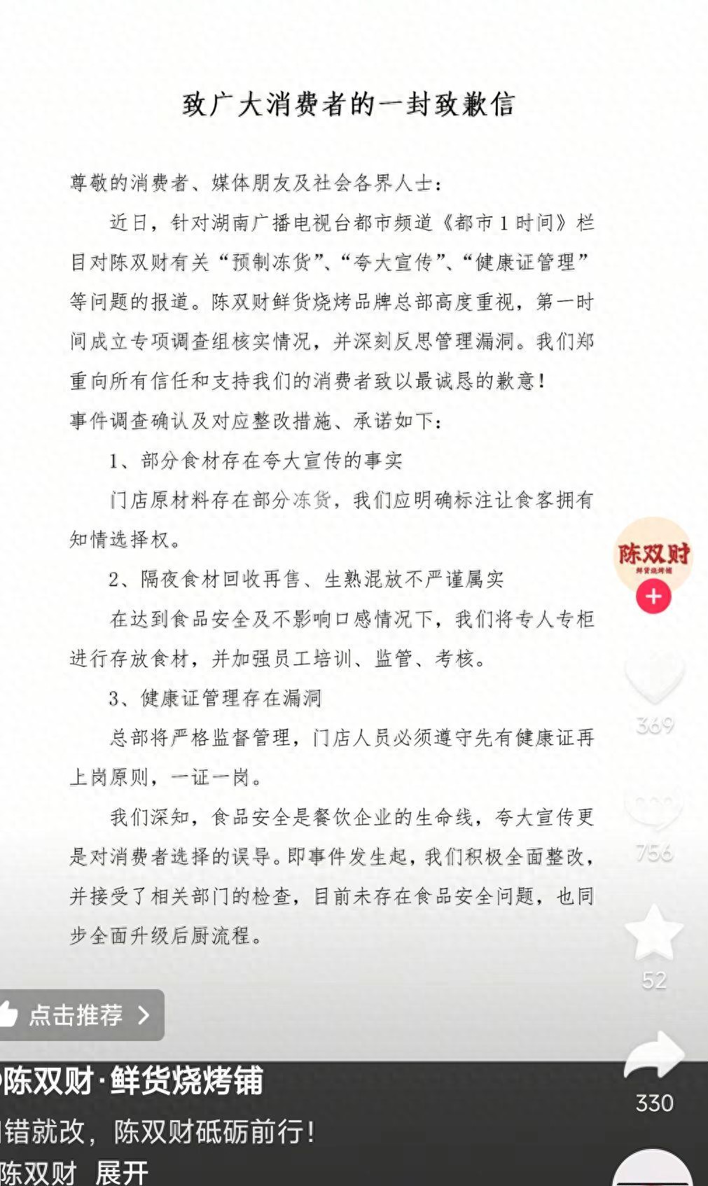 在道歉信中,陈双财称,“近日,针对湖南广播电视台都市频道《都市1时间》栏目对陈双财有关‘预制冻货’、‘夸大宣传’、‘健康证管理’等问题的报道。陈双财鲜货烧烤品牌总部高度重视,第一时间成立专项调查组核实情况,并深刻反思管理漏洞。我们郑重向所有信任和支持我们的消费者致以最诚恳的歉意!”