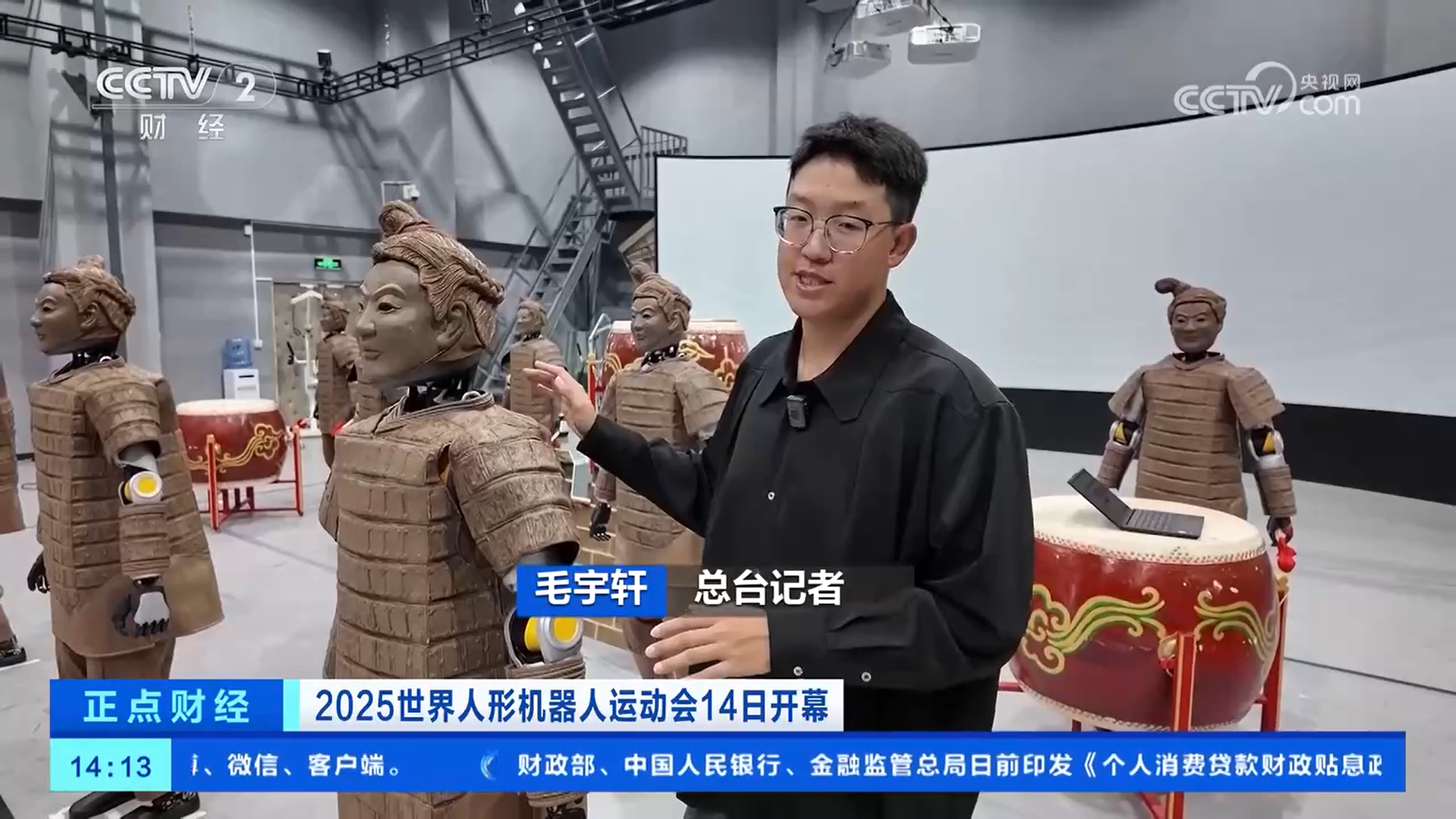 总台记者毛宇轩:在我身边就是9台即将参加此次人机共舞表演的人形机器人,大家可以看到,机器人从发髻、面部再到身上的盔甲,以及后面散热的织物全部由3D打印完成,完全贴合机器人的可动关节以及身形,为什么要这么做呢?就是为了保障机器人在进行舞蹈表演的时候可以尽量舒展,可以没有任何的束缚和负担。这台机器人不仅仅是工业产品、科技产品,它更是艺术加技术的融合。