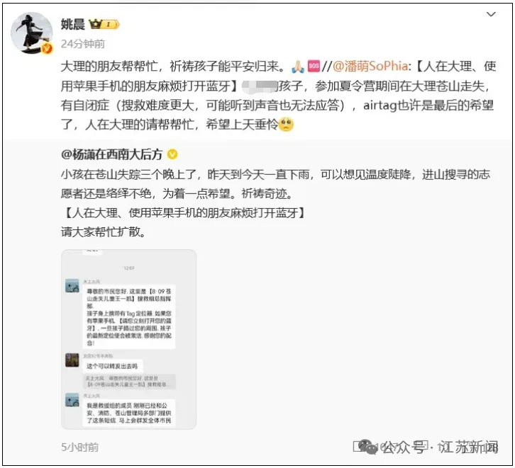 8月12日,演员姚晨转发相关微博为其发声求助:大理的朋友帮帮忙,祈祷孩子能平安归来。