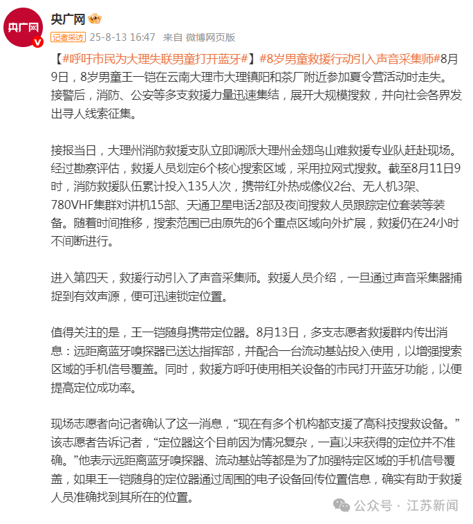 8月9日,8岁男童王一铠在云南大理市大理镇阳和茶厂附近参加夏令营活动时走失。接警后,消防、公安等多支救援力量迅速集结,展开大规模搜救,并向社会各界发出寻人线索征集。