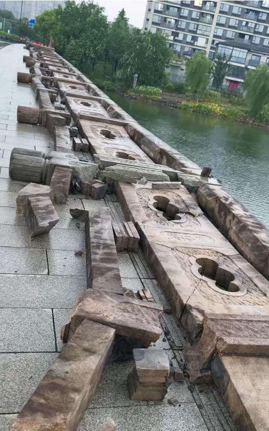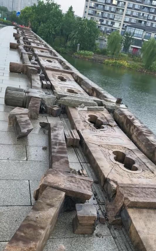 8月12日下午,有浙江网友发视频称,“一场暴风雨,桥围栏全倒了。”现场视频显示,桥边一侧石护栏整齐地倒在桥面上,有些已经出现碎裂损毁。