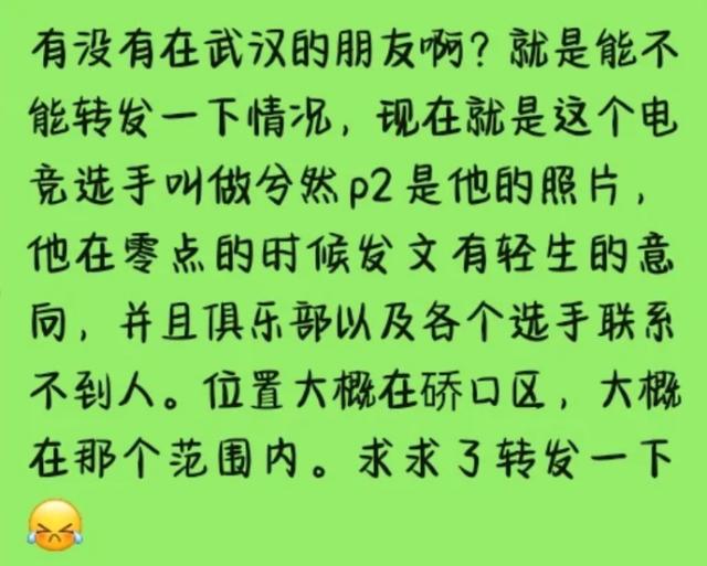 微博发出后,很快引起网友的紧急救援。微博定位湖北,引发全网寻人。兮然的前俱乐部“eStarPro”于01:16报警并联系家属,警方介入搜救。友人“雨季小子”透露其可能位于武汉硚口区长丰街附近,呼吁当地居民协助报警。