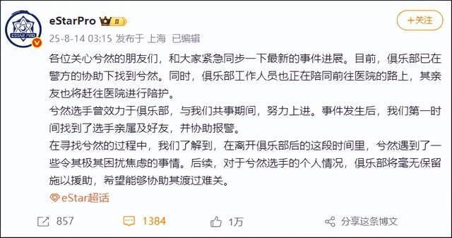 凌晨3:15,“eStarPro”发文称,已在警方的协助下找到兮然。同时,俱乐部工作人员也正在陪同前往医院的路上,其亲友也将赶往医院进行陪护。
