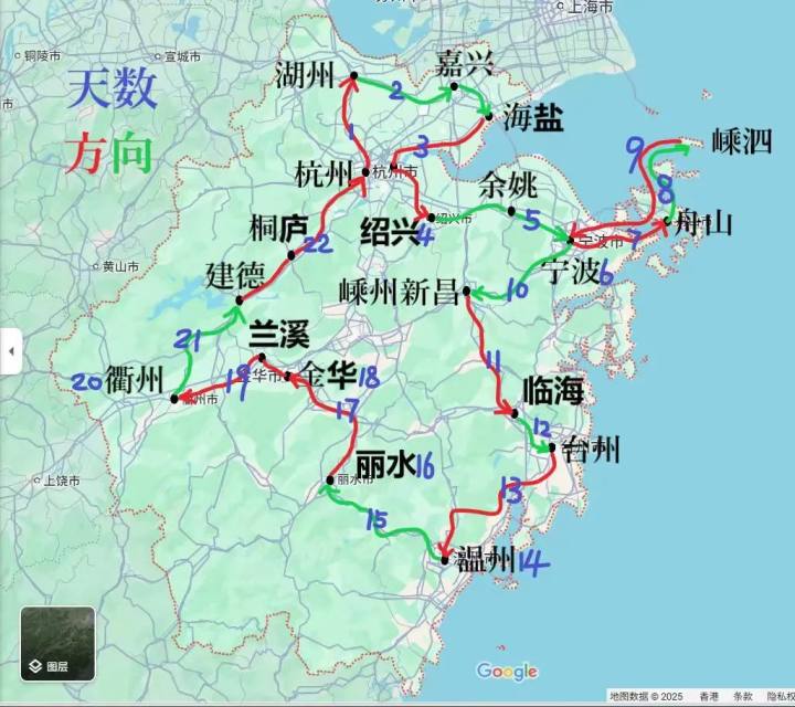按顺序是:从杭州出发,依次经过湖州、嘉兴、绍兴、宁波、舟山、三门、台州、温州、丽水、金华、衢州,从桐庐回到杭州市区。